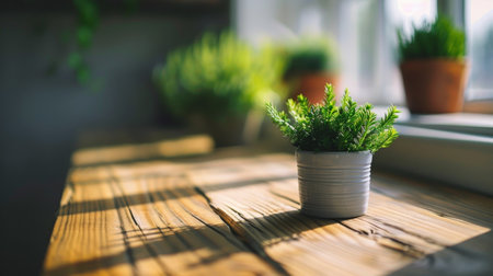 A minimalistic potted plant on a rustic wooden table, bathed in natural sunlight with soft shadows, creating a warm and serene atmosphere.