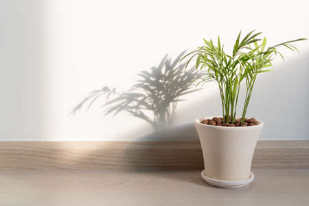 The tiny bamboo palm tree in the ceramic pot shows full of pot and its shadow shading on the white wall