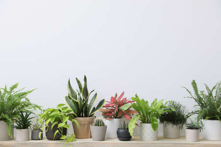A variety of green indoor plants displayed in rustic pottery on a wooden table, creating a natural and cozy ambiance.