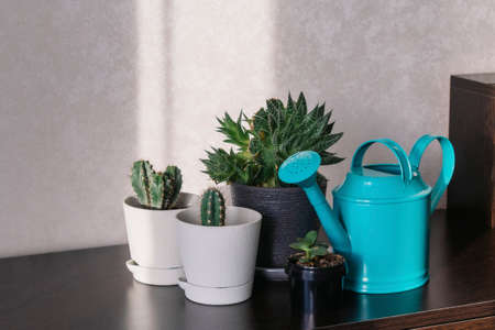 Indoor plants in white and black pots in the room on the table under the sunlight next to a turquoise watering can. Concept of indoor plant care.