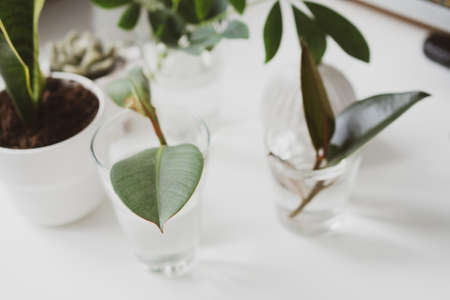 Small beautiful houseplant Dwarf Ficus Benjamin or Weeping Fig Tree in an white small flowerpot on white-gray background. Concept of care and cultivation of indoor home plants. copyspace.