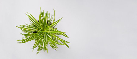 House plant Chlorophytum comosum on white table. Banner with space for text