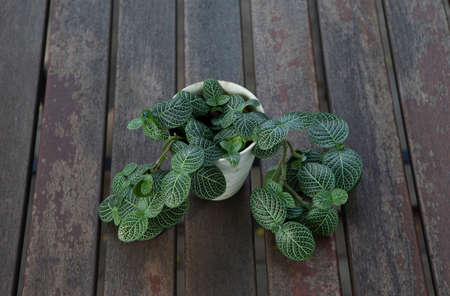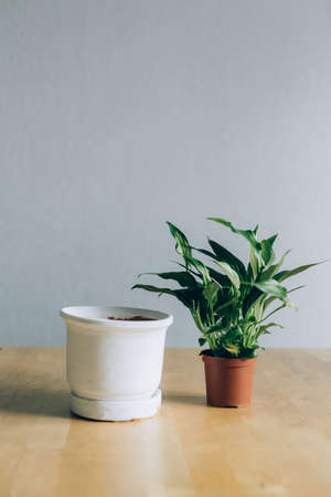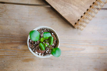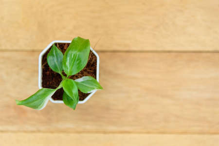 Beautiful green plant in a pot on a wooden table. Selective focus.