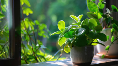 A vibrant green plant sits by a sunlit window, filling the indoor space with natural light. This scene evokes tranquility and freshness, perfect for a calming home atmosphere.