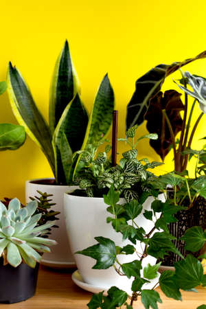 Indoor home garden plants. Collection various flowers - Snake plant, succulents, Ficus Pumila, lyrata, Hedera helix, Alocasia sanderiana. Stylish botany composition of home interior yellow background