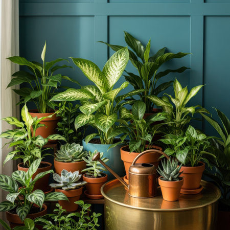 A variety of potted plants with different leaf patterns and colors, arranged on a golden table against a teal paneled wall, creating a serene and natural ambiance.