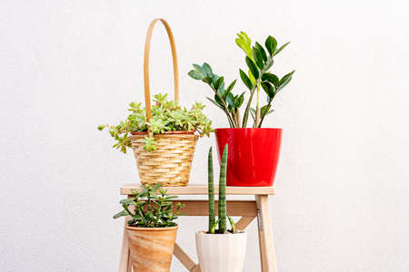 Horizontal shot of a raw wooden staircase with four plants, succulents, sansevieria cylindrica, echeveria and zamioculca in a red pot and white background of a terrace