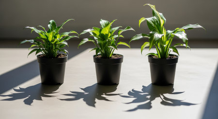 Three green houseplants in black pots casting long shadows on a sunlit indoor floor in a minimalist modern home interior.