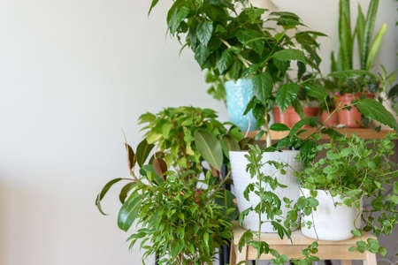 Apartment corner with many home plants in different pots on table, chairs and floor. Home garden