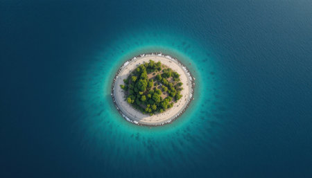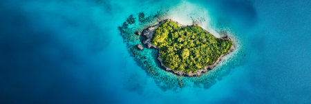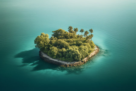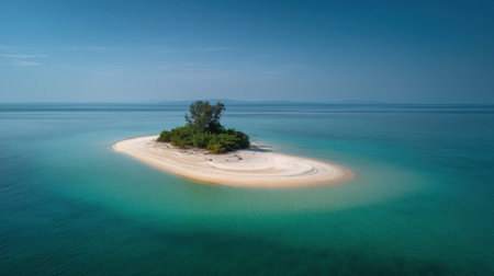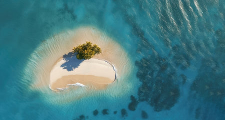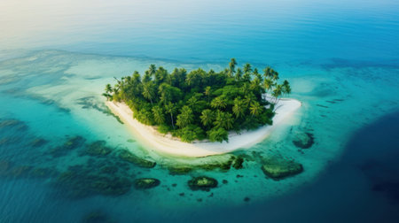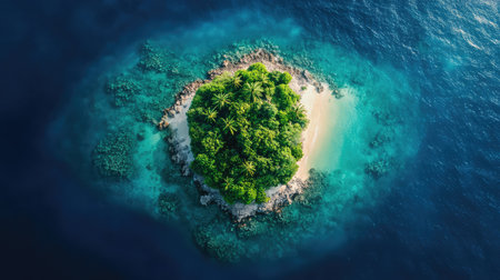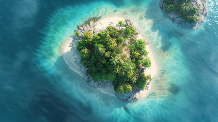 Aerial view of a small tropical island surrounded by turquoise water, secluded and serene