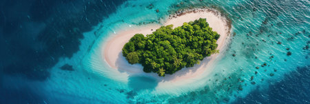 This stunning aerial image captures a remote tropical island with sandy beaches and crystal-clear waters, offering a glimpse into paradise and tranquility.