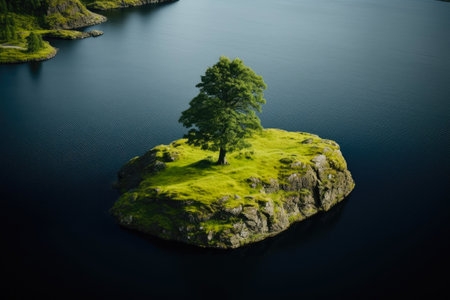 an island emerges from the deep blue ocean, adorned with a solitary palm tree standing tall in the center. this captivating birds-eye-view photograph captures the essence of abandoned spaces, with its dark white and dark orange hues. the colorized image showcases the beauty of dutch landscapes, making it a perfect addition to any documentary travel photography collection. ai generated