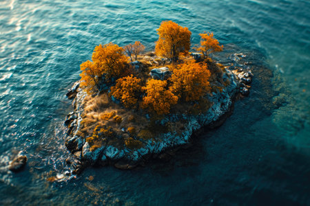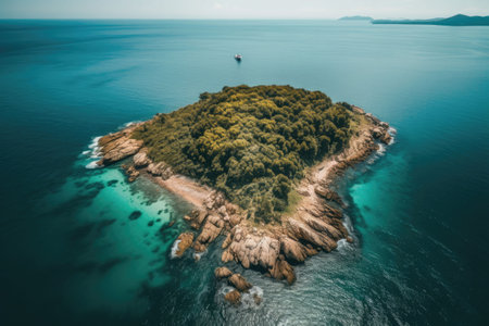 a small island adorned with lush trees, captured from an aerial perspective, showcases the breathtaking expanse of the ocean. this vray-traced photograph by petros afshar beautifully captures the essence of romantic ruins, playing with light and shadow. the matte finish of the image enhances its artistic appeal, while the use of rtx technology adds a touch of realism to the scene. ai generated