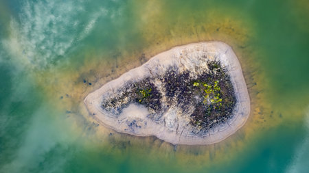 Great aerial view of opal blue water and an isolated little island. The water is crystal clear, beautiful structures can be seen underwater. High quality photo
