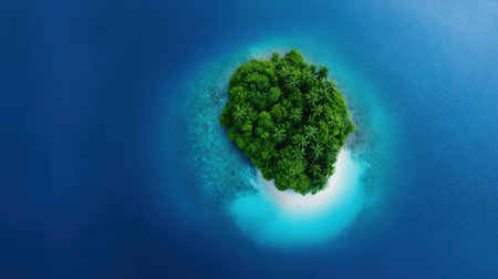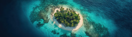 Breathtaking overhead view of a pristine tiny island ringed by crystal-clear turquoise waters, lush palm groves, and powdery white sands. Perfect for paradise travel ads, luxury resort banners, and exotic vacation promotions evoking ultimate seclusion.