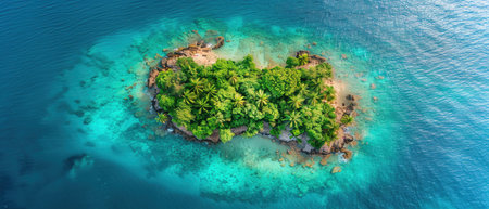 A small tropical island features dense greenery with palm trees and sandy shores surrounded by crystal clear turquoise water on a sunny day. Perfect natural paradise view.