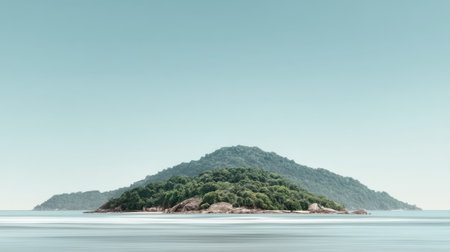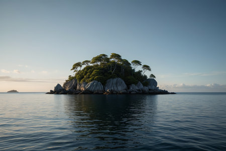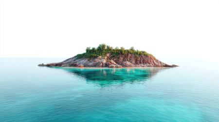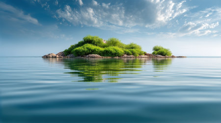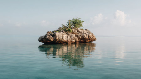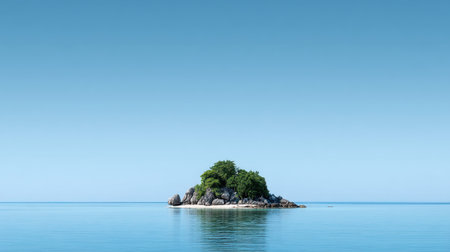 A breathtaking view of a small rocky island with lush greenery, perfectly reflecting in the tranquil waters beneath a clear sky, emphasizing peace and natural beauty.