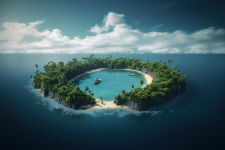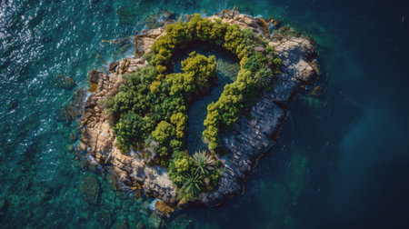 heart-shaped island in the ocean, featuring nature-inspired camouflage. this captivating photo showcases the beauty of italian landscapes with minimalist backgrounds. the contrasting colors of dark white and teal create a visually stunning composition. a perfect example of documentary travel photography, capturing the essence of coastal and harbor views. the light gold and azure tones add a touch of elegance to this breathtaking image. ai generated