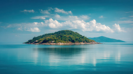 Travel and summer vacation. Illustration of sea and beautiful green nature island. Natural island at ocean. Beauty of nature concept backgrounds. Copy ad text space. Generative Ai illustration