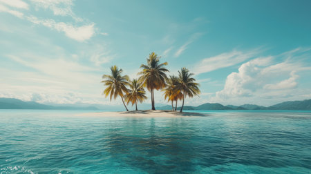 Discover a tranquil tropical island oasis, featuring vibrant palm trees and crystal-clear water surrounded by serenity, ideal for vacation and relaxation themes.