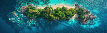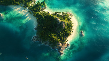 Aerial view of a lush green tropical island surrounded by crystal clear turquoise water, creating a breathtaking natural paradise, perfect for wanderlust and travel destinations