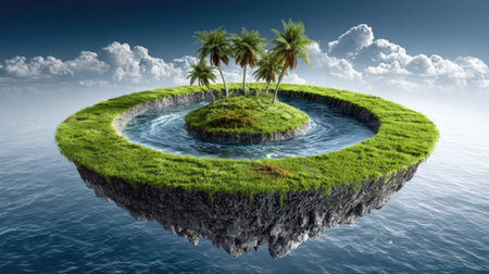 A vibrant image depicts a surreal floating island with lush green grass, palm trees, and clear water. The composition showcases a circular island in a bright, sunny environment, with puffy clouds and a vast ocean in the background. Suitable for conceptual illustrations or designs, the image may find applications in various commercial contexts.