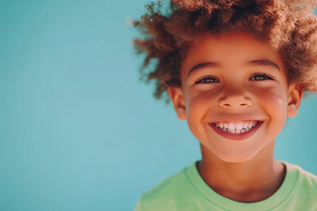 A young boy with curly hair smiles broadly, showcasing his joyful personality against a vibrant blue backdrop, capturing a moment of happiness and playfulness in an outdoor environment.
