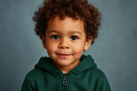 Curly haired young child smiling in a green hoodie against a neutral background with natural expression and soft lighting.