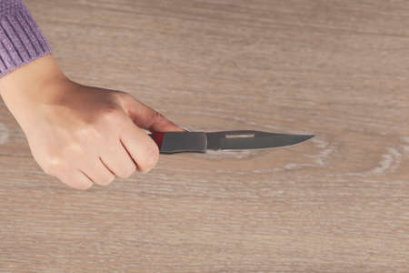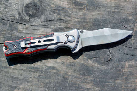 Pocket knife on the wooden table background. Old folding knife on the background of a wooden table close-up.
