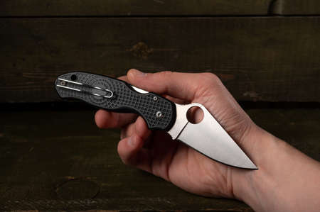 Pocket knife in the hand. Knife with plastic handle and clip. Hold the knife in your hand.