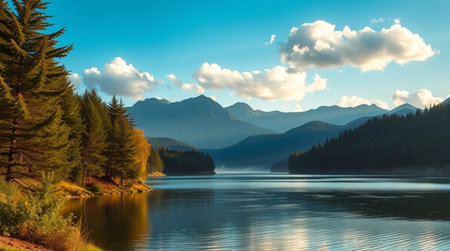 A body of water surrounded by trees and mountains. AI generative image.