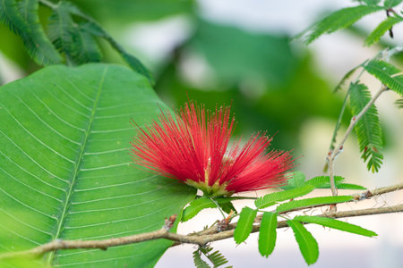 Macro shot of a blooming red powder puff flower with lush green leaves, highlighting its vibrant color, fine texture, and natural beauty in soft daylight.