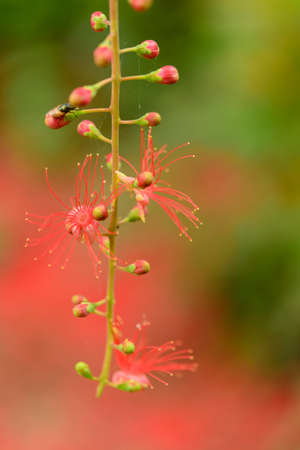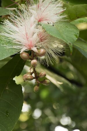 Flowers of Barringtonia asiatica or Fish Poison Tree or Indian Oak or Bottle Brush Oak (Barringtonia racemosa Roxb) hanging on the tree with leaf and blur background