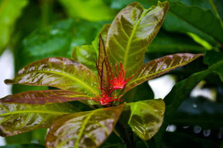 Closeup of barringtonia asiatica plant and red flowers. Newly sprouted green leaves and flowers from an unknown tree.