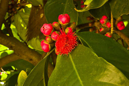 A water apples (Syzygium aqueum) flower on its tree, known as rose apples or watery rose apples