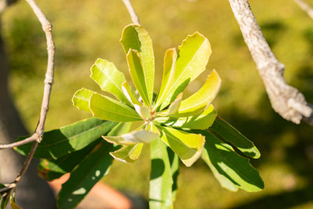 detail of frangipani plant outdoor in sunny backyard shot at shallow depth of field