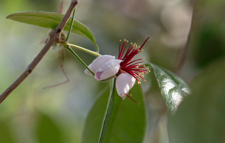 Close-up of Feijoa sellowiana flowers in bloom, showing vivid red stamens, white petals, and green leaves in natural light.