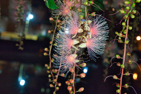 Barringtonia racemosa or powder puff tree flower at night in Yilan, Taiwan. Strings of flowers hang from the trees like fireworks. Taken in the summer of 2020.