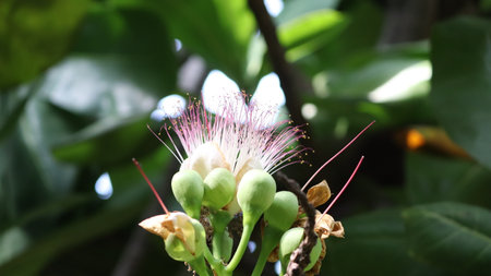 Okinawa, Japan-June 23, 2020: Flowers of Barringtonia racemamosa or powder-puff tree in the morning at Miyakojima island in Okinawa, Japan
