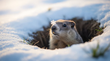 Groundhog with snowflake on nose peeking from snow burrow, winter wildlife.