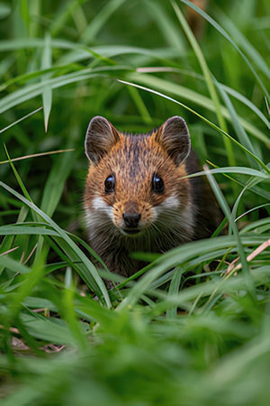 A charming small mouse sits gracefully among lush greenery and delicate flowers, embodying the beauty of wildlife in its natural habitat. Perfectly captured in a serene moment, this image showcases the intricate details and vibrant colors of nature.