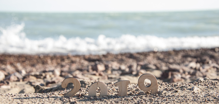 New Year concept - ‘2019’ formed on background of beach sand. With blurred vintage styled background.