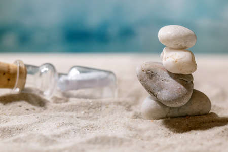 Stack of different smooth stones in balancing composition on summer sand sea beach with glass bottle and waves at background. Copy space creative layout. Vacation balance concept.