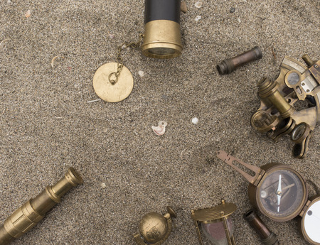 Background about travel and adventure with Antique sextant, compass, telescope on the beach near the sea
