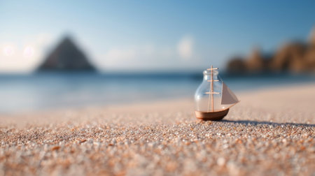 A person holds a glass bottle containing a miniature sailboat against a beautiful beach backdrop, with clear blue water and a distant ship under a bright sunny sky.