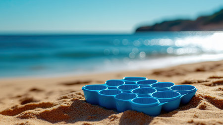 A toddler's plastic sandcastle mold set, arranged in the beach sand near a half-built sandcastle, with the blue ocean shimmering in the distance.