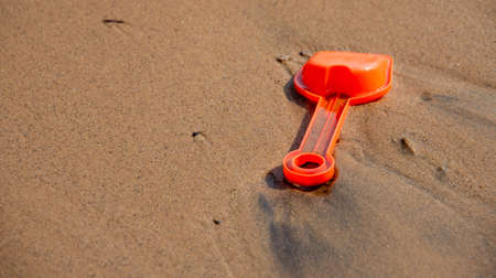 Children's toys on the warm sand of the beach of a wild lake in Quebec, Canada