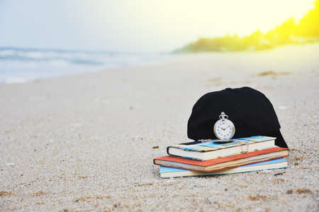 A cap is placed near the clock. And the book stack is placed on the beach.