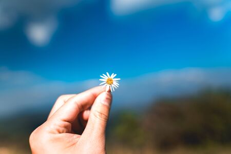 Man Holding Cosmos Flower in the Hand Above the Old Wooden Table : Generative AI