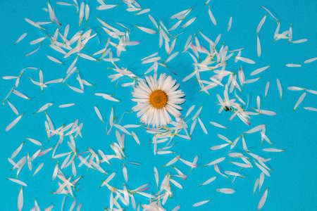 daisy flower in the middle of blue background around many petals, creative concept flower in the sea, romantic scene, spring design